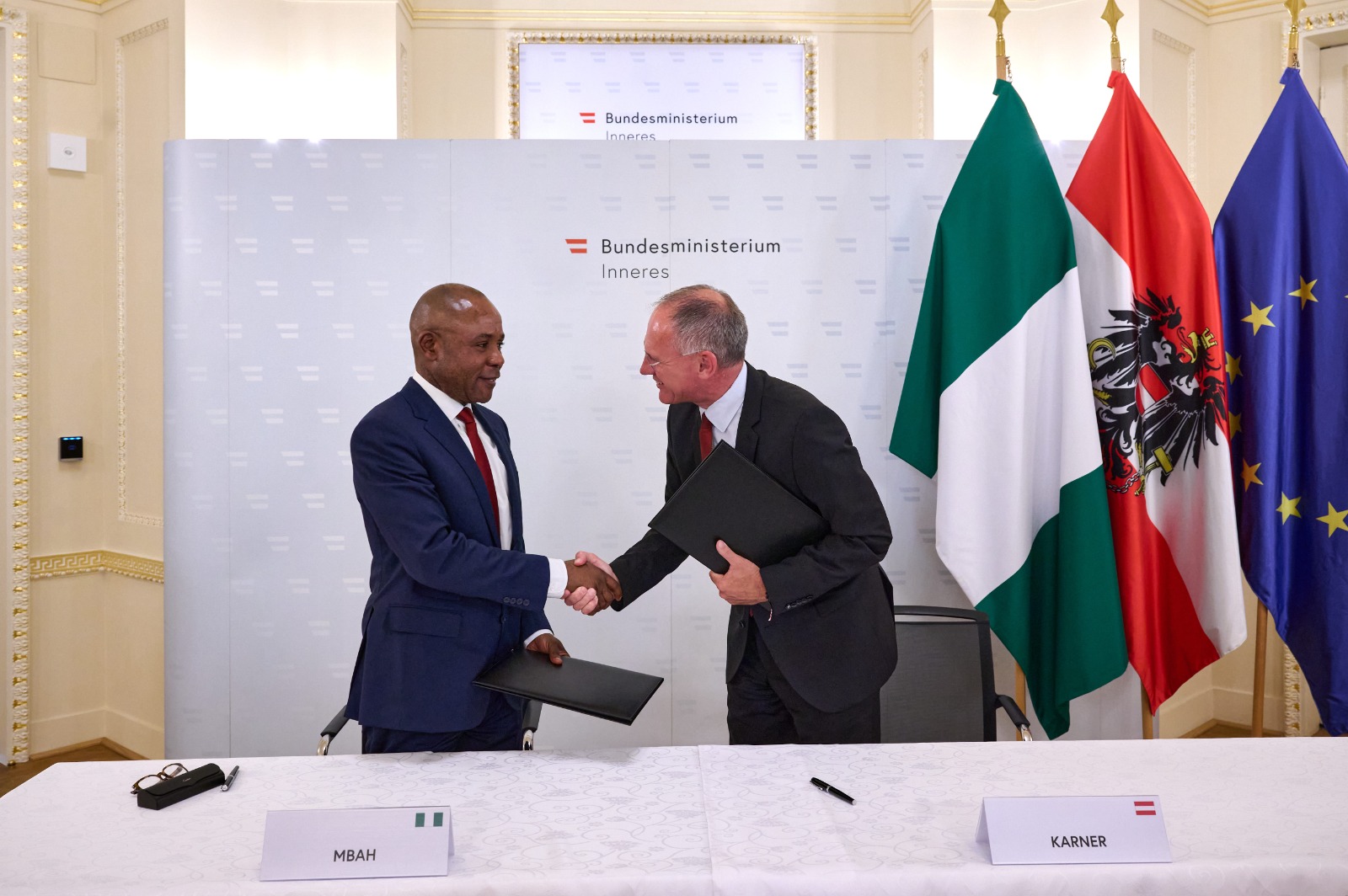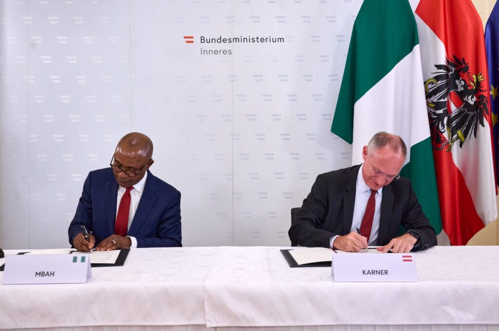At the meeting with Austria’s Minister of Interior, Karner, Mbah and his host agreed to partner across various sectors with opportunities in Nigeria for Austrian SMEs.