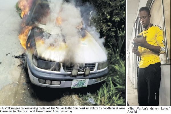 A Volkswagen car conveying copies of The Nation to the Southeast was burnt at Awo Omamma in Oru East Local Government Area.
