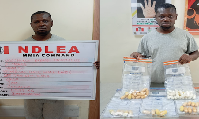 A Nigerian returnee from Brazil identified as Udechukwu Ekene Theophilus has been arrested by the National Drug Law Enforcement Agency (NDLEA) for ingesting 60 wraps of cocaine.