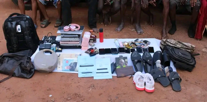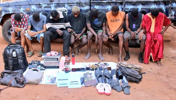 “The arrested suspects include Ismaila Isah (aged 23), Sadik Ahmed (a dismissed soldier, aged 28), Abbas Usman (aged 33), Mubarak Garba (aged 24), Abubakar Haruna (aged 23), Abubakar Sani (aged 32), Obiri Chukwuebuka (aged 22), and Bright Omeniru (aged 22).: