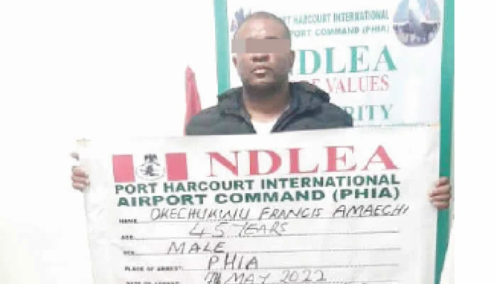 A statement on Sunday by the NDLEA Director of Media and Advocacy, Femi Babafemi, said the 45-year-old ex-convict from Idemili South LGA, Anambra State, was arrested at the Port Harcourt airport on Saturday, May 7, upon arrival from Brazil via Doha onboard a Qatar airline flight QR1433.