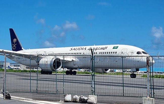 A Saudia airline Boeing 787 Dreamliner bound for Singapore and carrying Sri Lanka's fleeing president Gotabaya Rajapaksa, his wife and two bodyguards prepares to take off at the Velana International airport in Male. Photo: AFP