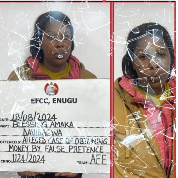 Blessing Amaka David-Agwa is being prosecuted by the Enugu Zonal Directorate of the Economic and Financial Crimes Commission, EFCC on a 45-count charge bordering on impersonation, forgery and obtaining by false pretence to the tune of N28, 278, 600 (Twenty-eight Million, Two Hundred and Seventy-eight Thousand, Six Hundred Naira).