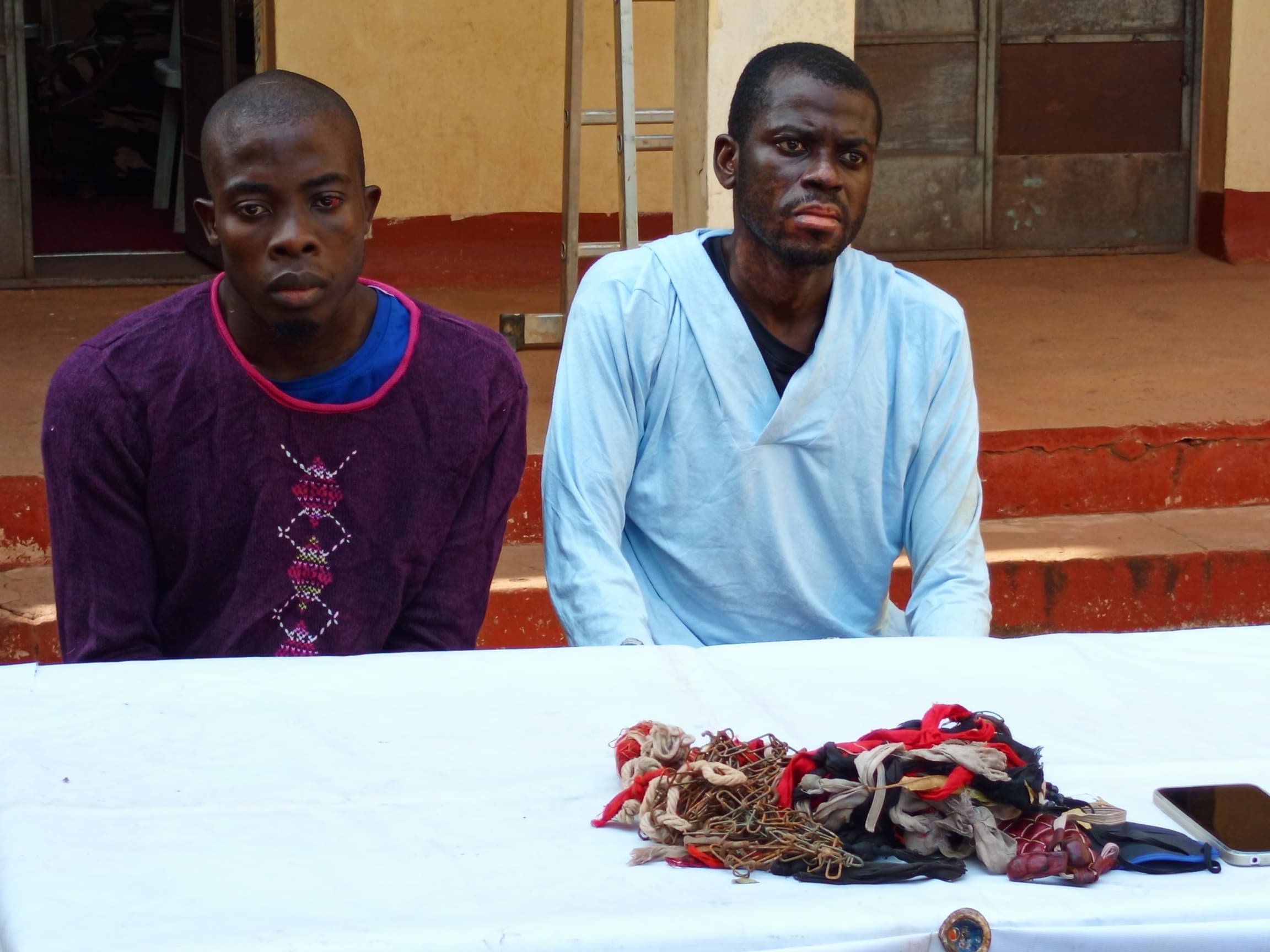 The suspects are assisting the police in the ongoing investigations to apprehend the mentioned accomplices on the run, and to recover the stolen vehicles and tools used to commit these crimes. One (1) Tecno Android phone, snatched from a victim in the crimes, and objects suspected to charms were recovered from them.