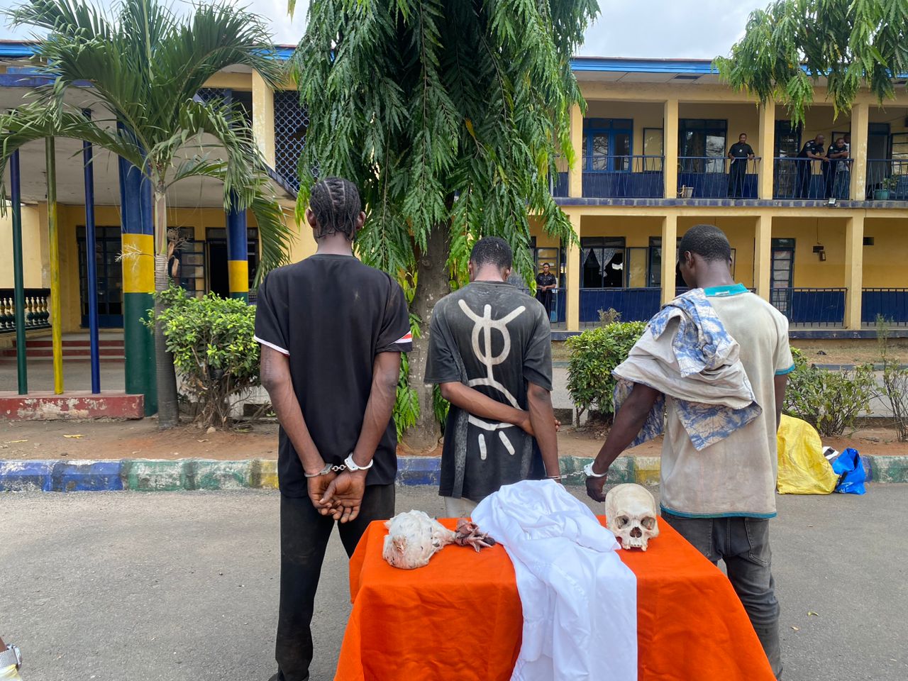 The three individuals arrested—Patrick Okoere (29), Ifeanyichukwu Anyaemeka (28), and Chukwuemeka Onyekachi (20)—are currently under investigation. During questioning, Patrick stated that his uncle, Osunta Oko, had asked him to acquire a human skull. He claimed to have found it along a riverbank on the Okigwe-Umuahia Expressway, an area where the command has received cases of kidnappings.