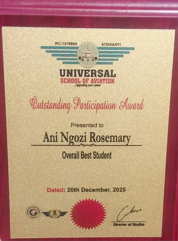 – Ani Ngozi Rosemary – _Overall Best Aviation Student in Nigeria (2025)_ and recipient of the Outstanding Participation Award.