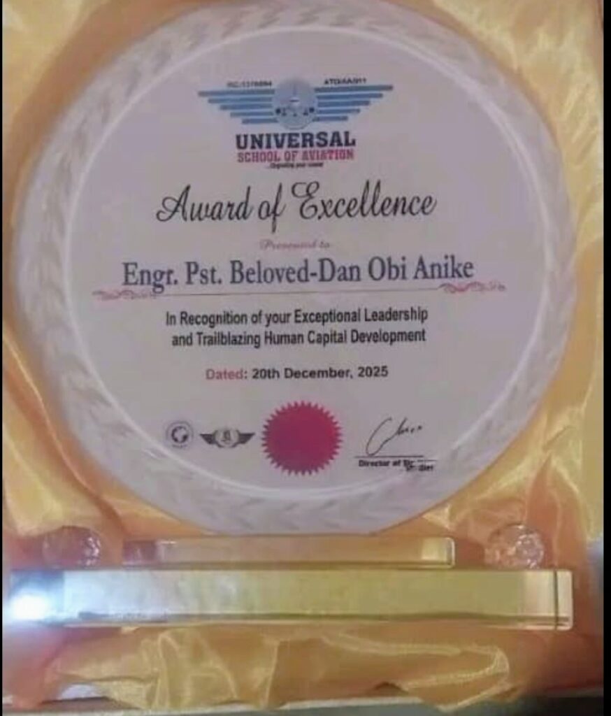 In a moment of pride and fulfillment, Engr. Pst. Beloved‑Dan Obi Anike, Executive Chairman of Enugu East Local Government Area, was honored with the Award of Recognition for Exceptional Leadership and Trailblazing Human Capital Development during the 14th Convocation Ceremony of the Universal School of Aviation (USA) held in Lagos State.