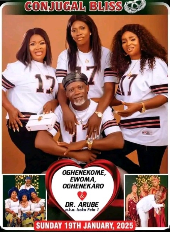 In the viral marriage flier, Arube was pictured in the same dress as his three to-be wives, Oghenekome, Ewoma, and Oghenekaro, all from Delta State.