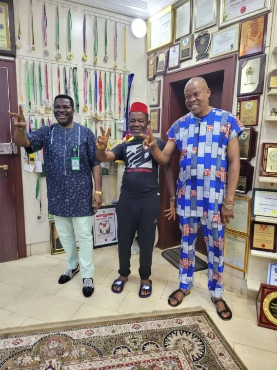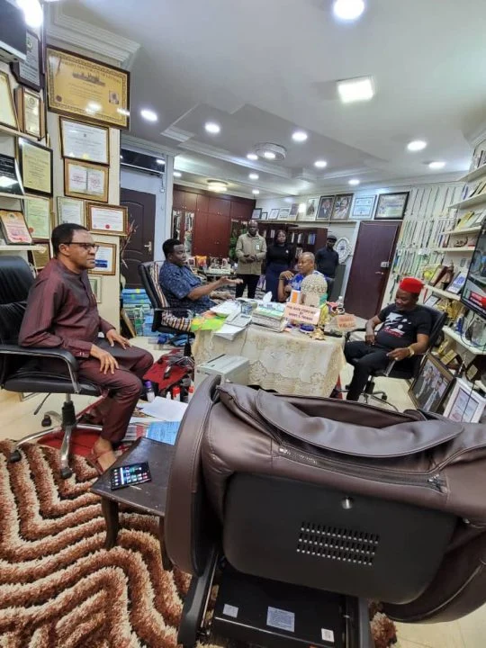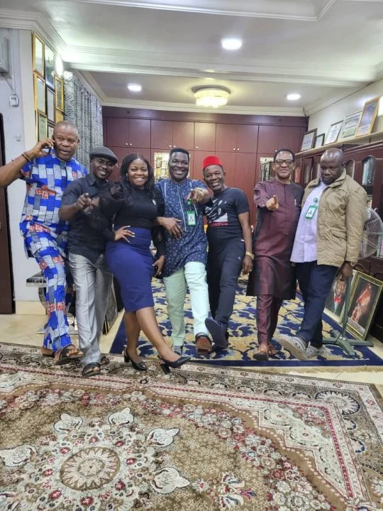 Nollywood actor, Chiwetalu Agu, and representatives of the Actors Guild of Nigeria paid a courtesy visit to human rights lawyer, Mike Ozekhome (SAN), after the actor’s release from the Department of State Services.