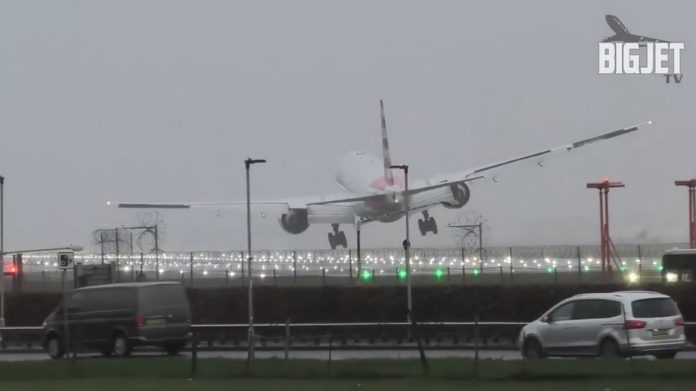 A London-bound airplane from California made a dicey landing at London Heathrow Airport on Wednesday, as crosswinds appeared to cause the aircraft to tip before touching down and bouncing.