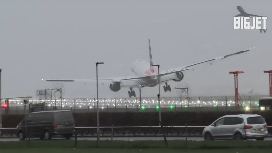 Video shows the moment a Boeing 777 operated by American Airlines encountered crosswinds as it made a hard landing at London Heathrow Airport during Storm Gerrit on Dec. 27, 2023.