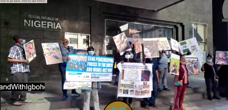 The Yoruba Nation and Biafra agitators earlier resumed their protest at the headquarters of the United Nations before moving to the Nigerian embassy.