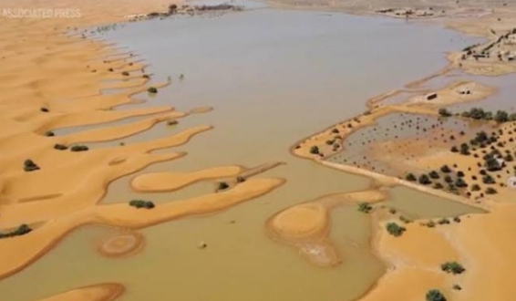 Heavy rainfall in the Sahara Desert has created large lakes amid sand dunes, drastically altering the barren landscape.