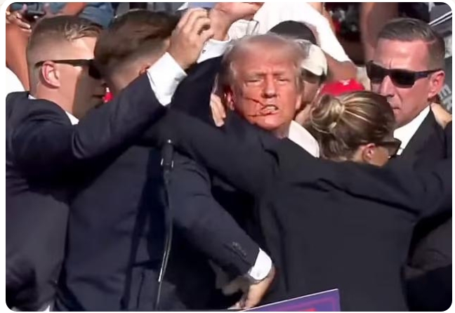 Trump suddenly grabbed his ear and had blood covering his face after at least eight shots were fired and the crowd started screaming as Secret Service agents swarmed around him.