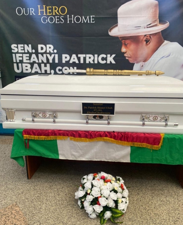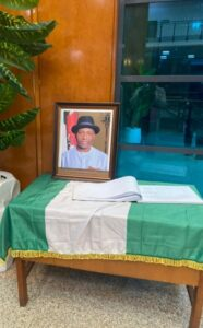 Ubah’s seat in the chamber was adorned with flowers and draped in a cloth painted in the colours of the Nigerian flag.
