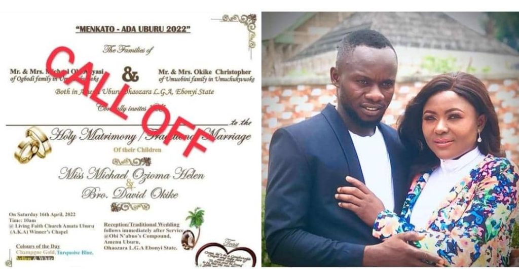 “I AM CALLING OFF THE WEDDING AND TRADITIONAL MARRIAGE (IGBA NGWU) BETWEEN ME AND DAVID OKIKE that supposed to hold on this Saturday 16th, April 2022.