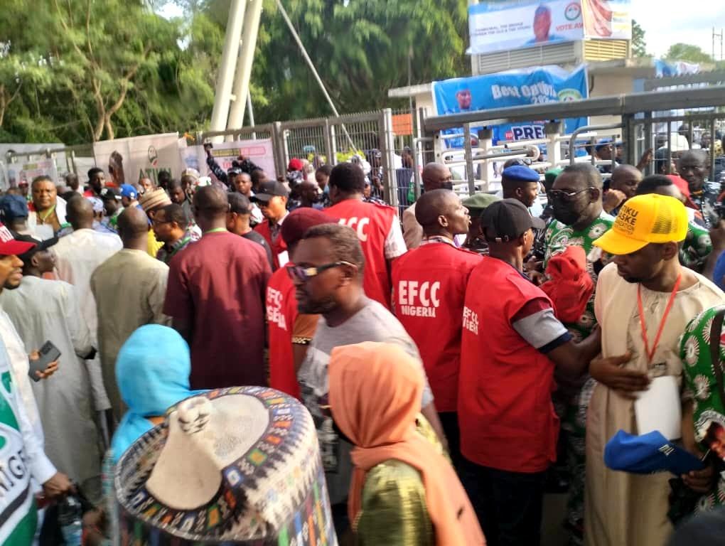 Over a dozen of EFCC officers dressed in their official red overcoats with EFCC boldly written behind were sighted moving around the PDP delegates’ stand.