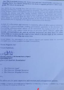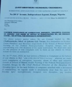 “Sir, on 7 June, 2023, we had written a Petition of Complaint at the behest of our clients in Ref:BC/CDE/BCCH/VOL.C/70/2023, whereat we made overt complaints of corruption, impunity, abuse of office and unlawful closure of School of Mental Health Nursing of the Federal Neuropsychiatric Hospital, Enugu by the Chief Medical Director of the Hospital Dr. Monday Igwe.