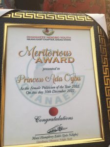 Foremost sociocultural Igbo youth group, Ohanaeze Ndigbo Youths have presented to Princes Ada Ogbu the ‘Outstanding Female Politician of the Year Award’.