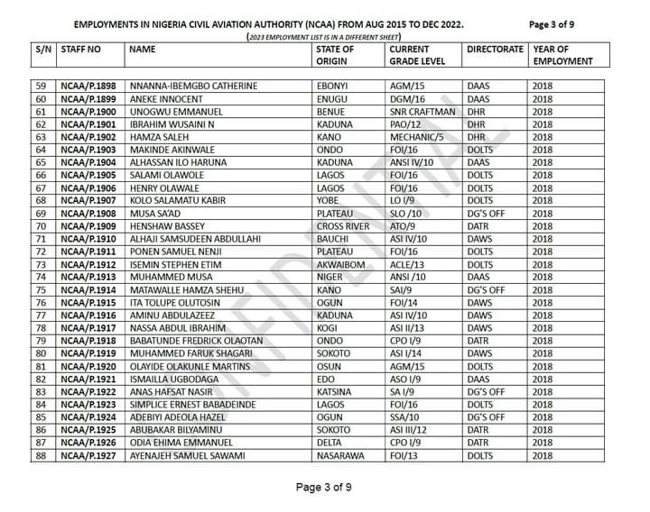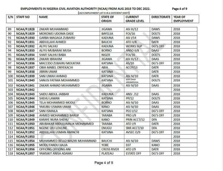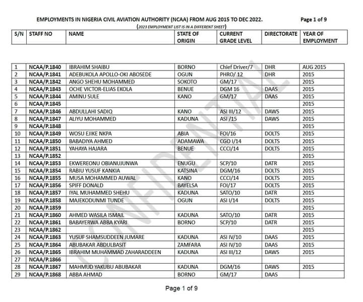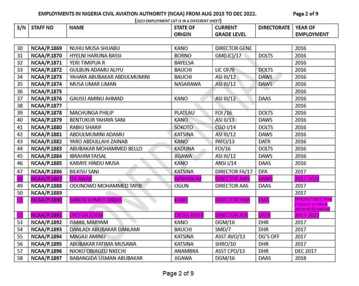 A document titled, ‘Some names of persons employed in Nigeria Civil Aviation Authority (NCAA) in 2023,’ shows that out of 54 already given employment letters, 36 names had no state of origin attached to them.