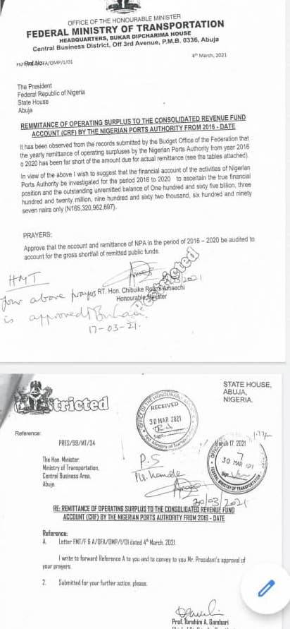 According to a release by President’s spokesman, Garba Shehu, President Buhari approved the recommendation of the Ministry of Transportation for the setting up of an Administrative Panel of Inquiry to investigate the Management of NPA.