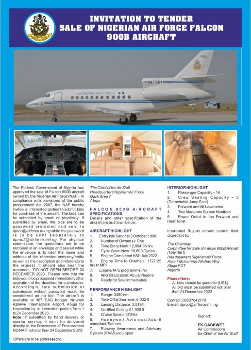 The announcement partly read, “The Federal Government of Nigeria has approved the sale of Falcon 900B aircraft owned by the Nigerian Air Force (NAF).
