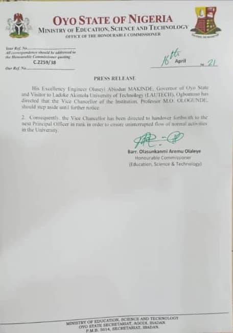 The letter reads in part, “His Excellency, Engr. Seyi Makinde, the governor of Oyo state and the visitor to the Ladoke Akintola University, Ogbomoso has directed that the Vice Chancellor of the institution, Prof. M. O. Ologunde should step aside until further notice.