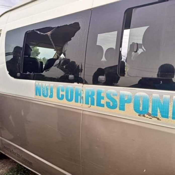 The perpetrators, holding clubs, charms, stones, and axes, smashed the vehicles’ side screen, leaving four journalists injured.