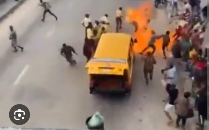 A shocking incident occurred on Tuesday, when a commercial bus driver set himself, his bus, and a LASTMA officer ablaze in an attempt to evade arrest for a traffic offence.