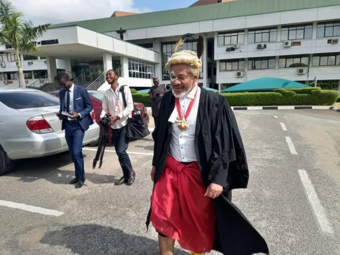 The lawyer also appeared bare footed with cowries tied on his two legs. His wig had two long feathers, with cowries in his two hands and tied a red wrapper, while he wore his lawyer’s gown on it.