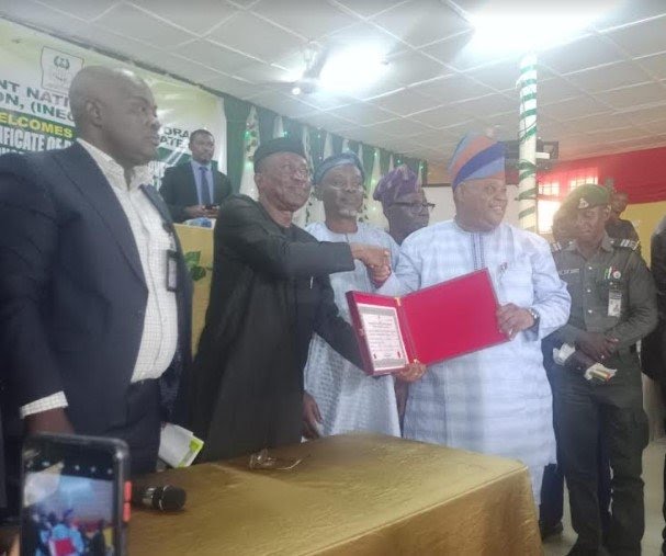 Electoral Commission on Wednesday presented the certificate of return to Osun State Governor-elect, Senator Ademola Adeleke.