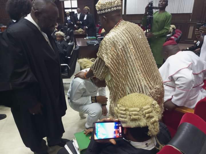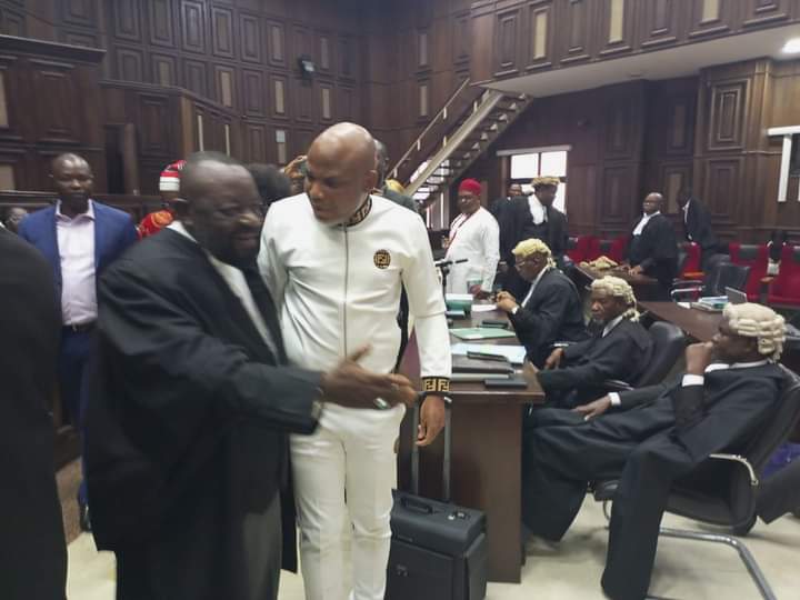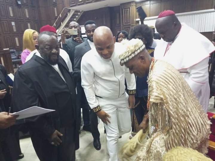 Nnamdi Kanu was ushered into the courtroom of the Federal High Court, Abuja by operatives of the Department of State Services at about 10:05 am on Monday as his trial resumes