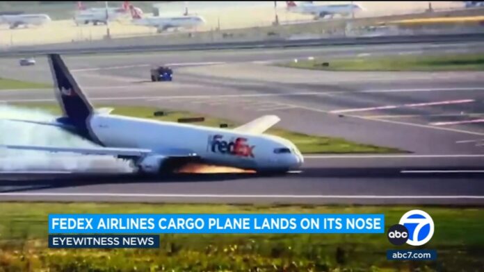 A Boeing-767 type cargo plane operated by FedEx ran into a couple of bumps and sparks as it attempted to land at Istanbul Airport in Turkey without its front landing gear Wednesday.
