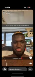 Despite the car crash, Boniface seems to be in good health but seemed to have sustained a cut on his left arm.He shared a picture of himself receiving treatment with a caption ‘Thank you Lord’.