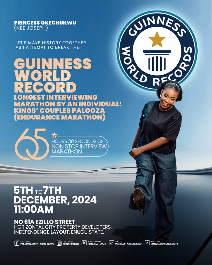 Popular Enugu-born relationship coach, Princess Joseph Okechukwu, who broke the Guinness World Record for the longest interviewing marathon by an individual has given reasons behind achieving such feat.