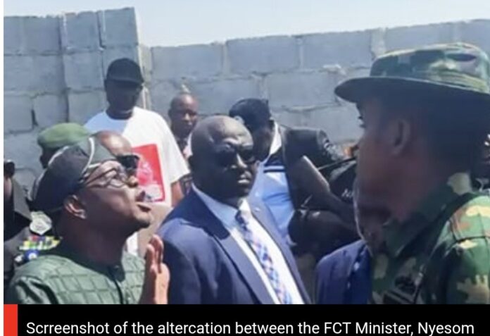 There was a heated confrontation on Tuesday between the Minister of the Federal Capital Territory, Nyesom Wike, and an unidentified military officer over an alleged land-grabbing incident at the Gaduwa District in Abuja.