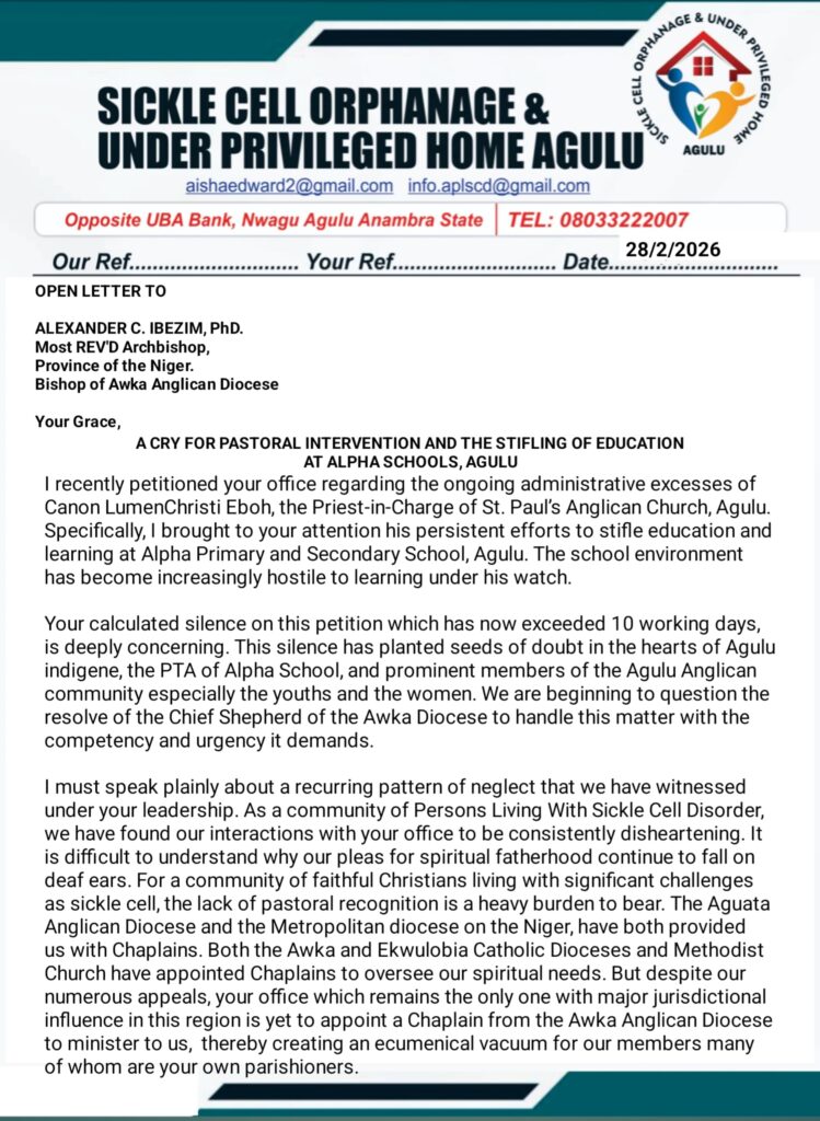 I recently petitioned your office regarding the ongoing administrative excesses of Canon LumenChristi Eboh, the Priest-in-Charge of St. Paul’s Anglican Church, Agulu. Specifically, I brought to your attention his persistent efforts to stifle education and learning at Alpha Primary and Secondary School, Agulu. The school environment has become increasingly hostile to learning under his watch.