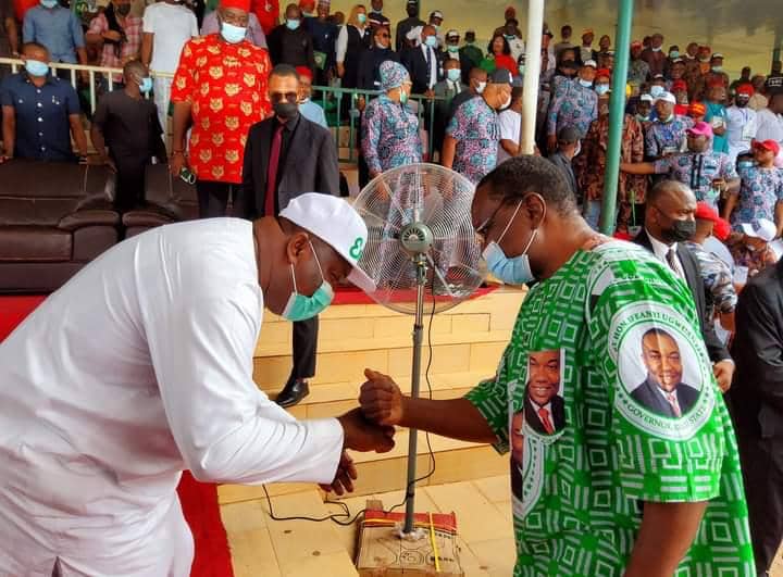 Onuaguluchi in a handshake with Ugwuanyi at the rally