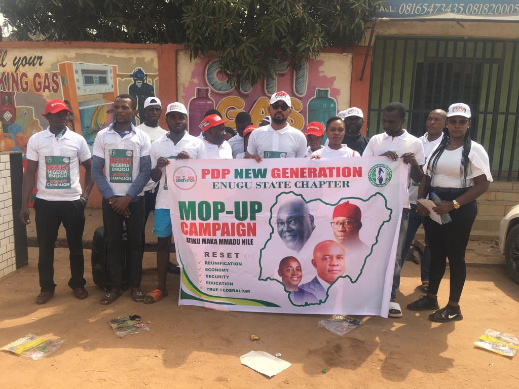The PDP new generation, a youth movement of the People Democratic Party PDP in Enugu state has held their last minutes mop up campaigns exercise across the senatorial zones in the state to ensure victory for Atiku Abubakar on Saturday.