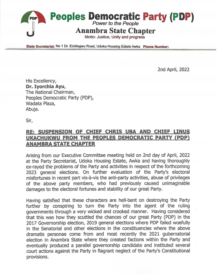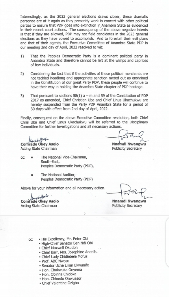 Arising from a crucial meeting of the State EXCO on Saturday 2nd April, 2022, the Peoples Democratic Party Anambra State Chapter has suspended two high-profile leaders of the party on account of their negative contributions to the party’s protracted internal crisis and unwarranted challenges.