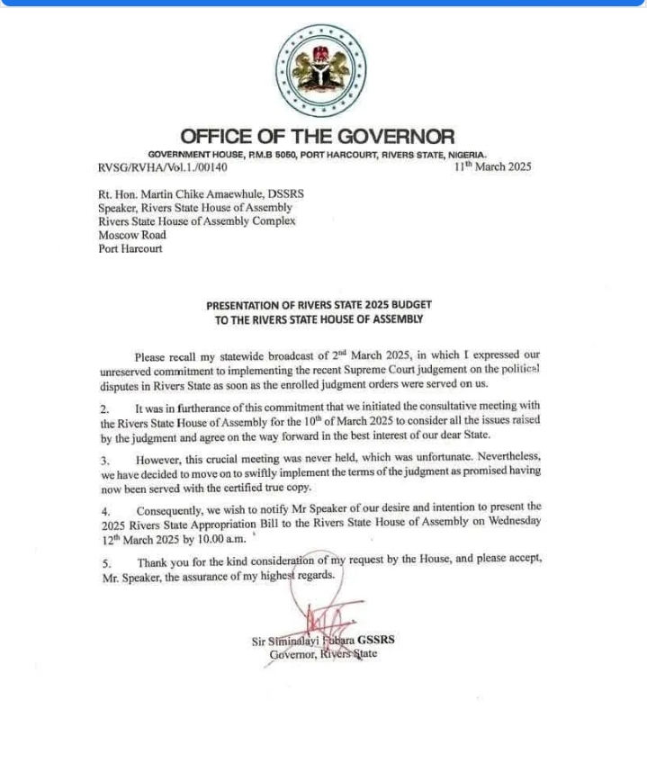 Titled “Presentation of Rivers State 2025 Budget to the Rivers State House of Assembly,” the document references Fubara’s statewide broadcast on March 2, 2025, in which he reaffirmed his commitment to implementing the Supreme Court’s verdict on the state’s political crisis, pending the receipt of the enrolled judgment orders..