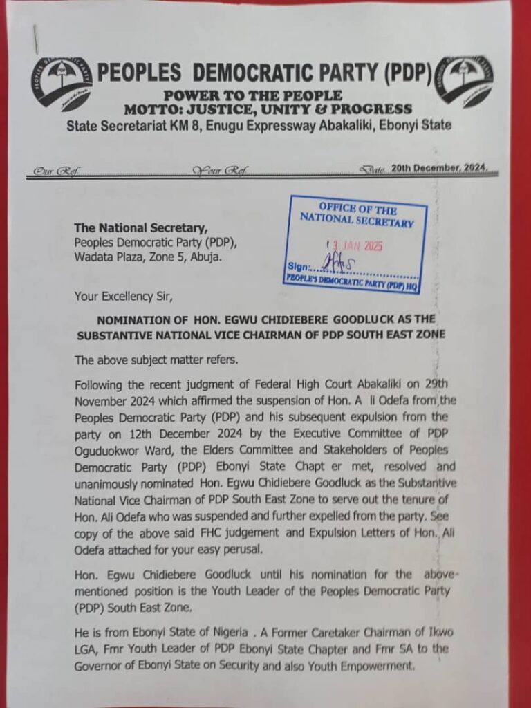 In a letter dated 20th December 2024 addressed to the Acting National Chairman of the party, Alhaji Illiya Damagun and the Chairman of the Board of Trustees, Senator Adolphus Wabara and made available to journalists in Abakaliki, the party said the nomination of Hon Egwu popularly known as Hulala hinged on the expulsion of Mr. Ali Odefa for a plethora of anti-party activities.
