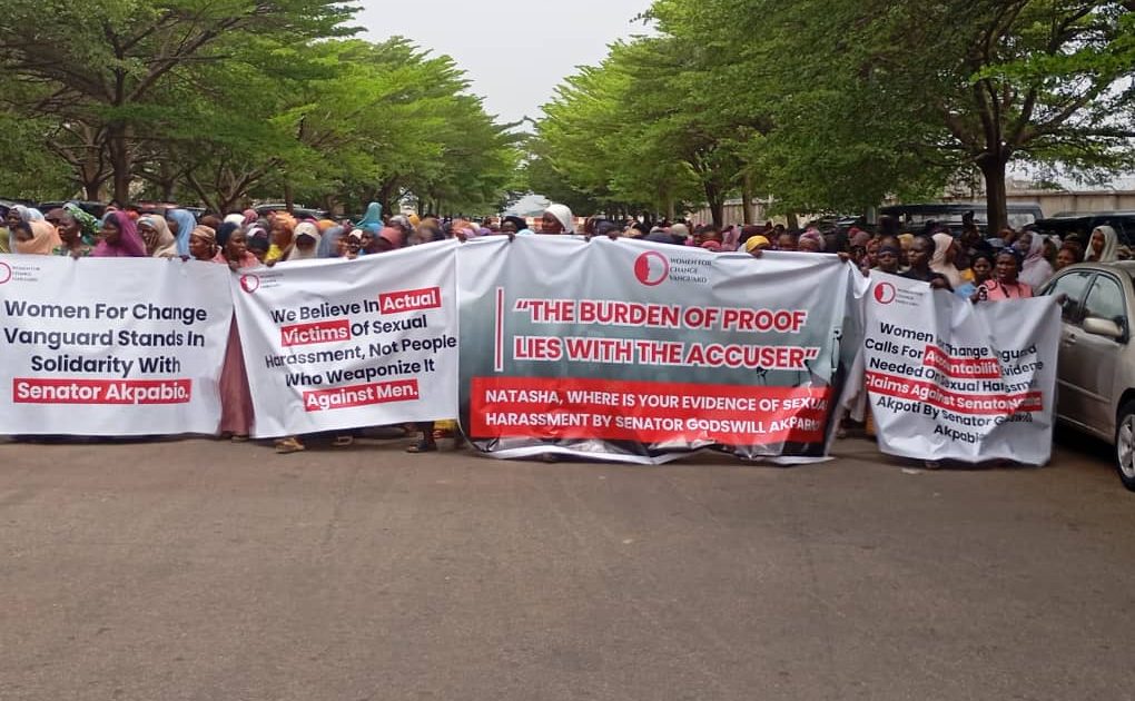 Chanting solidarity songs and displaying several banners that read ‘We believe in actual victims of sexual harassment, not people who weaponise it’ and ‘The burden of proof lies with the accuser”, the protesters challenged Akpoti-Uduaghan to provide evidence of the alleged sexual harassment she accused Akpabio of.