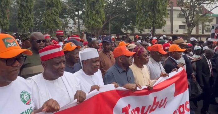 Addressing the protest, former presidential candidate Peter Obi spoke on behalf of ADC members and other opposition leaders, urging Nigerians to defend the country’s democracy.
