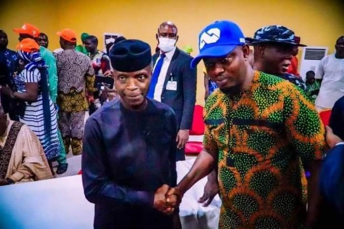 The Deputy Governor, Mr Benedict Alabi and Chairman of the All Progressives Congress in Osun State, Prince Gboyega Famodun welcome the Vice President.