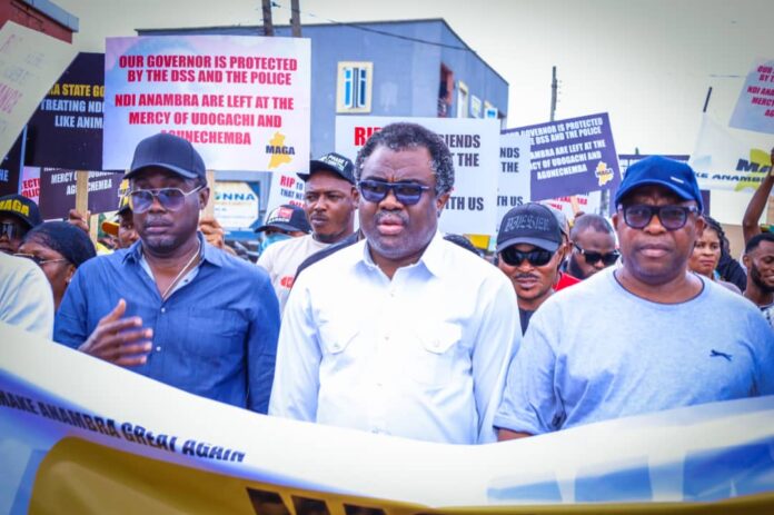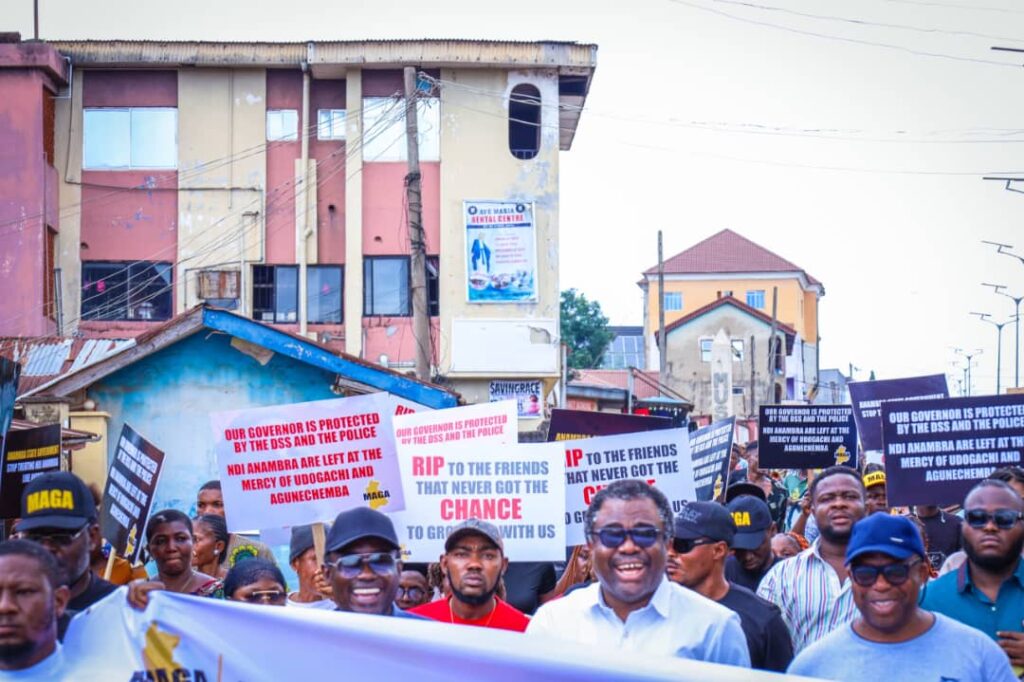 The plot to disarm the Agunechemba Security Squad in Anambra state was this Friday made bold when the gubernatorial candidate of the Action Alliance, AA Sir Paul Chukwuma and his running mate Chief Uzu Ukagbue led a protest match through the Nnamdi Azikiwe Avenue Awka against the assault on the corp member of the National Youth Service Corps NYSC.
