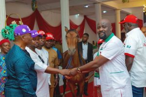 Reps candidate Festus Uzor receiving the horse from Prince Otiji