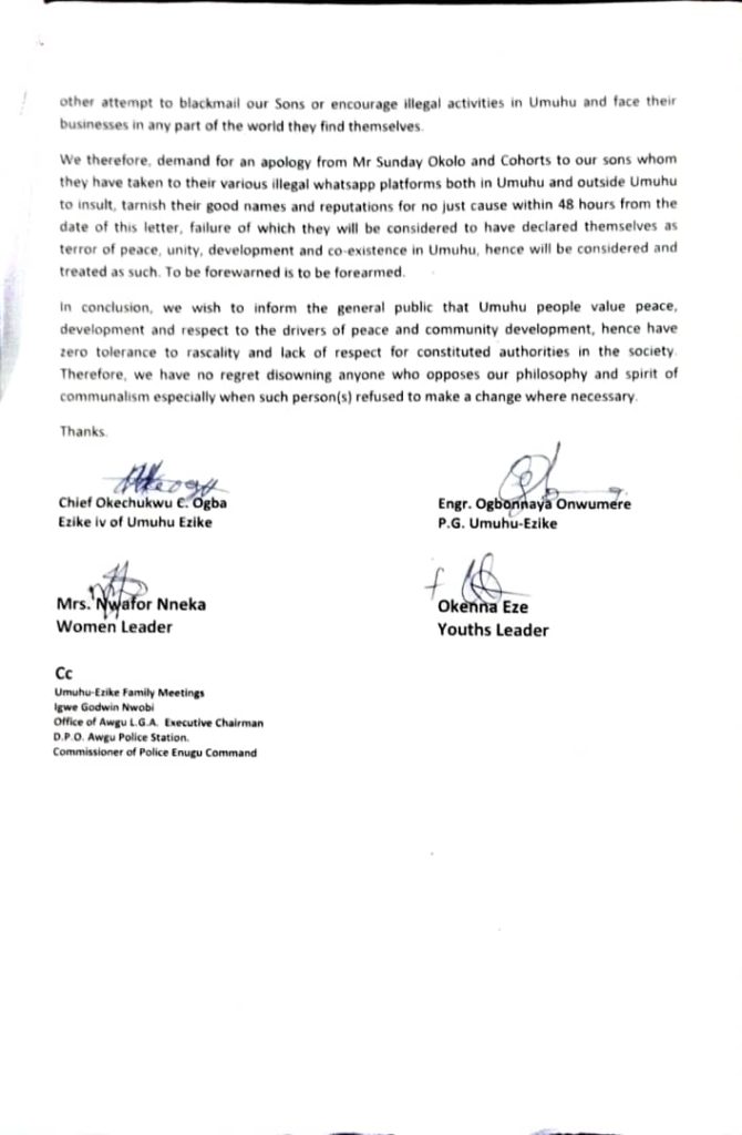 We therefore, demand for an apology from Mr Sunday Okolo and Cohorts to our sons whom they have taken to their various illegal whatsapp platforms both in Umuhu and outside Umuhu to insult, tarnish their good names and reputations for no just cause within 48 hours from the date of this letter, failure of which they will be considered to have declared themselves as terror of peace, unity, development and co-existence in Umuhu, hence will be considered and treated as such. To be forewarned is to be forearmed.