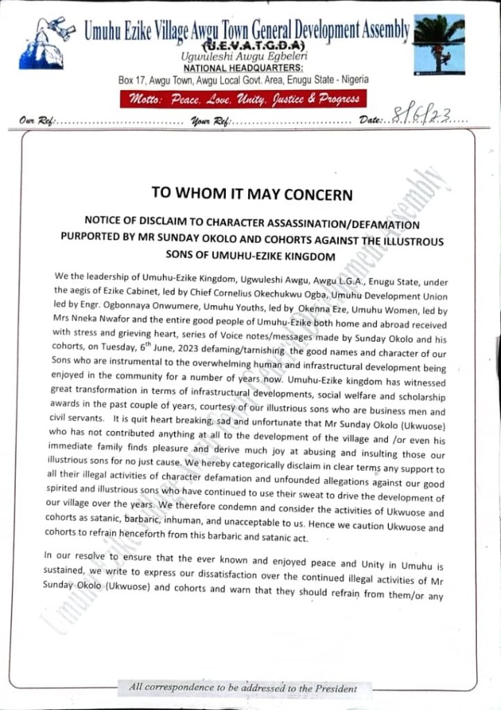We the leadership of Umuhu-Ezike Kingdom, Ugwuleshi Awgu, Awgu L.G.A., Enugu State, under the aegis of Ezike Cabinet, led by Chief Cornelius Okechukwu Ogba, Umuhu Development Union led by Engr. Ogbonnaya Onwumere, Umuhu Youths, led by Okenna Eze, Umuhu Women, led by Mrs Nneka Nwafor and the entire good people of Umuhu-Ezike both home and abroad received with stress and grieving heart, series of Voice notes/messages made by Sunday Okolo and his cohorts, on Tuesday, 6th June, 2023 defaming/tarnishing the good names and character of our Sons who are instrumental to the overwhelming human and infrastructural development being enjoyed in the community for a number of years now.