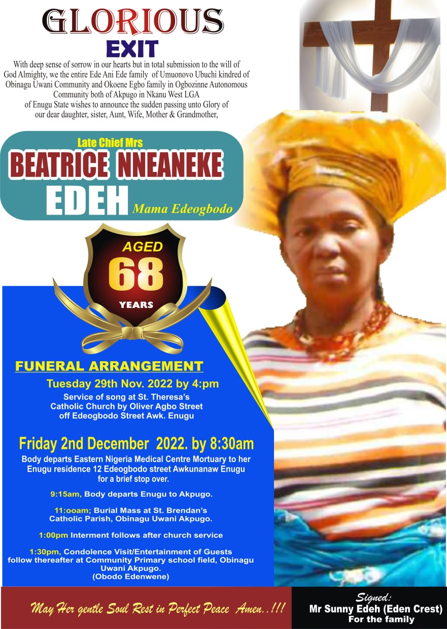A statement signed by son Mr. Sunny Edeh (Eden Crest) says her body departs Eastern Nigeria Medical Center Mortuary at 8:09am on Friday December 2nd, to her Enugu residence at No 12 Edeogbodo Awkunanaw, Enugu for a brief stop over.